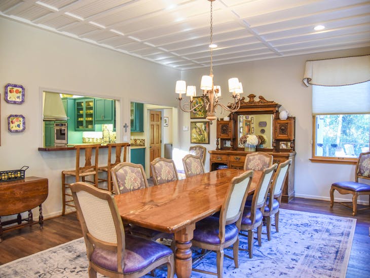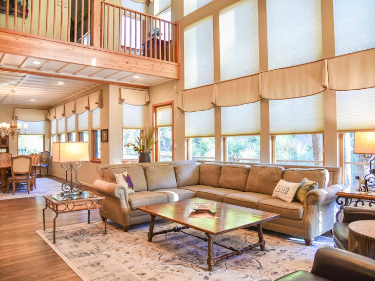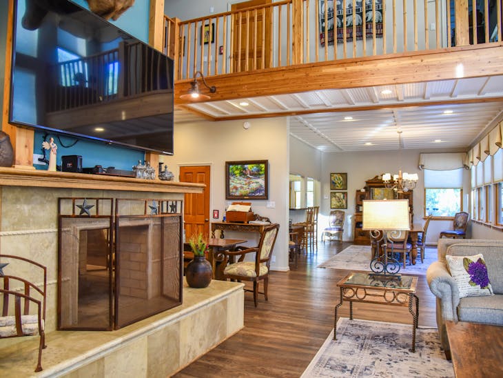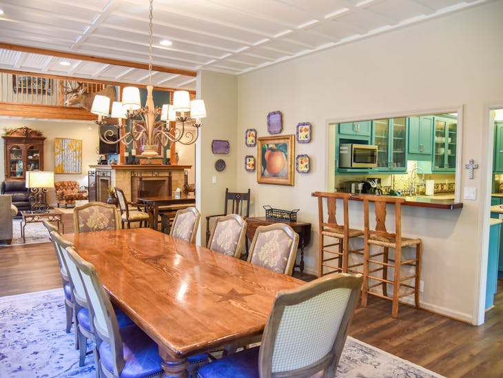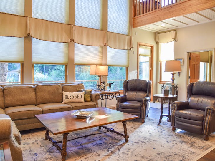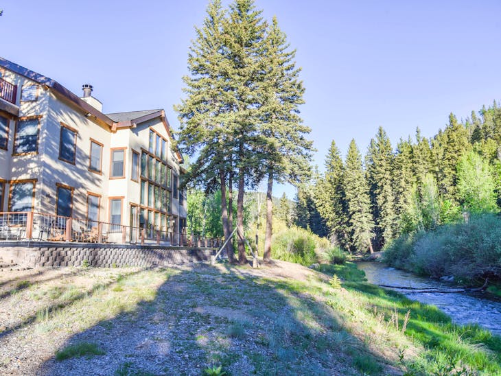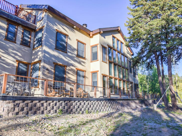 Welcome to River Lyric Lodge, one of Red River’s premier properties. Perfect for multi-generational families or large groups, this 8,500 sq. ft. luxury home boasts 7 bedrooms, 8 bathrooms, and expansive frontage on the Red River, just 400 feet from the brand-new Copper Chair lift. While not technically ski-in/ski-out, the lift is a short walk in your ski boots. Relax on the huge deck or the private balconies of the top-floor suites while listening to the river’s soothing flow. The first-floor suite features a gourmet kitchen perfect for multiple chefs, a dining area for the entire group, and a grand living room with a four-sided gas fireplace and floor-to-ceiling windows overlooking the river and Carson National Forest. Connected to the living room is an indoor hot tub room, and the “Almost Heaven” master suite offers a king bed, sleeper chair, and private bathroom with a tub and stand-up shower. The second floor features an open loft overlooking the first floor, 4 private bedroom/bathroom suites, and an alcove with a twin-over-full bunk. Suites include: Lone Star Suite – king bed + twin bunk beds Sleepy River Suite – king bed + double pull-out sofa Tea Time Suite – king bed + twin bunk beds Forest Dreams Suite – king bed + twin bunk bed A game room offers air hockey, foosball, pool, skee ball, checkers, and more—fun for both kids and adults. The third floor includes an open loft with office area, 2 additional king bedroom/bathroom suites, private balconies with river and mountain views, and extra sleeping with twin sleeper chairs and a double pull-out sofa. High-speed Wi-Fi ensures you can stay connected, and two whole-house fans provide natural cooling. Additional Details: Pet-friendly: up to 2 dogs under 60 lbs ($250 non-refundable fee) Parking: trailer parking available for ROVs Seasonal Minimums: 7 nights in summer (Saturday to Saturday); 4 nights during other periods (7 nights during peak) Check-in/Check-out: 4:00 PM / 9:00 AM Security hold: $650, released after property inspection including hot tub Elevator: Out of service and locked All reservations are subject to our rental terms, cancellation, and refund policy. Merchant service charges are non-refundable. Please contact us with any questions prior to your stay. No matter the season, River Lyric Lodge offers the perfect blend of luxury, comfort, and mountain charm for an unforgettable Red River getaway.