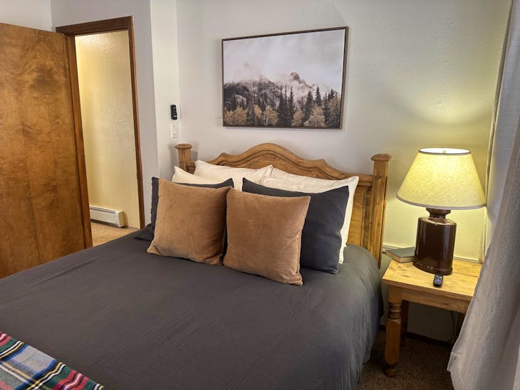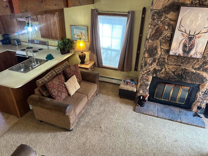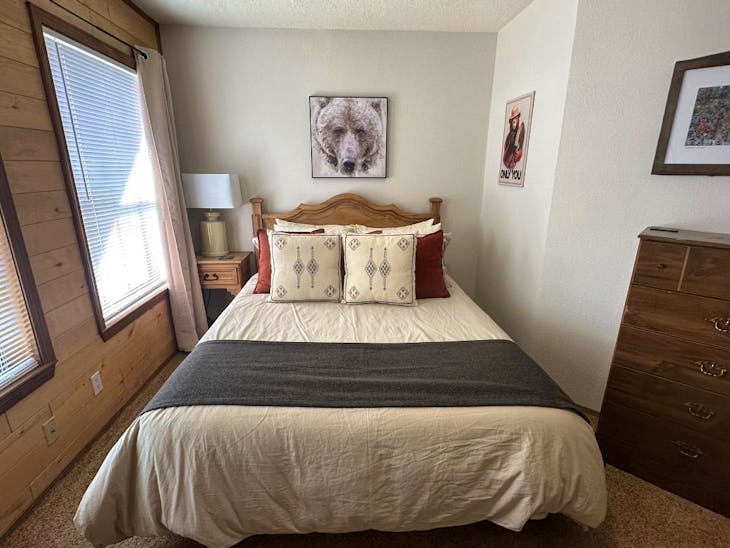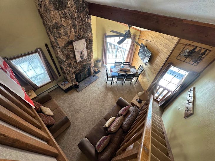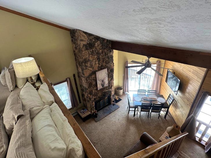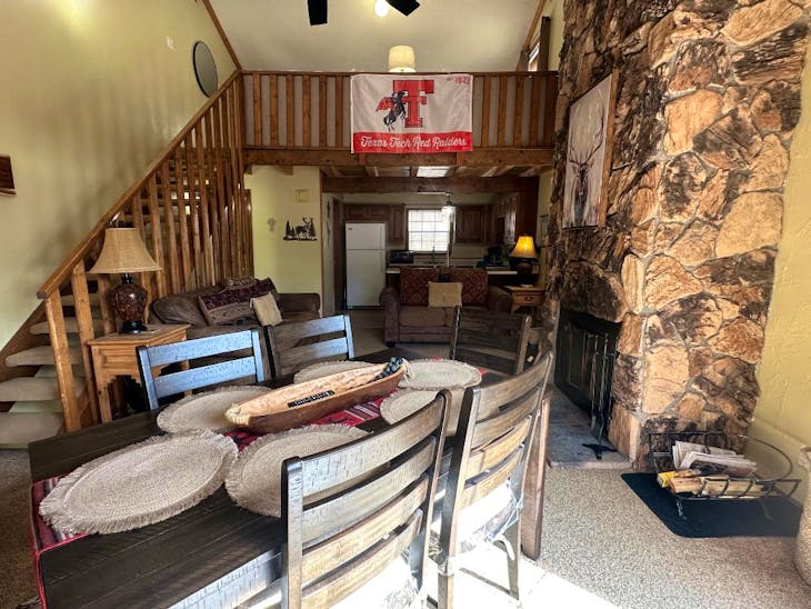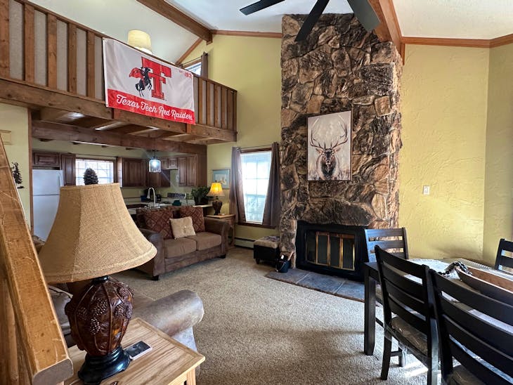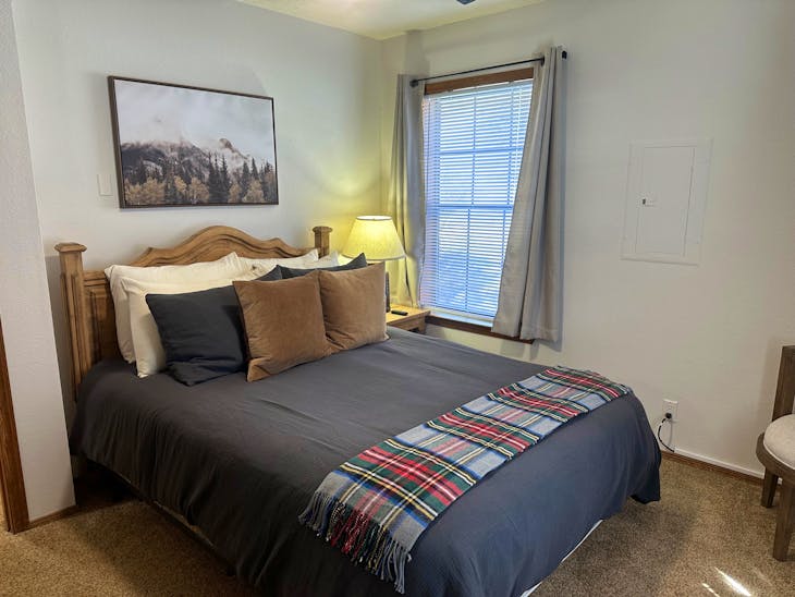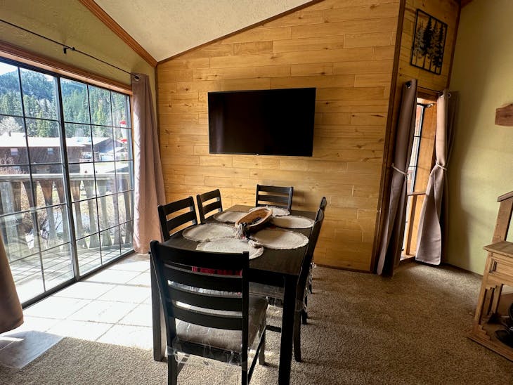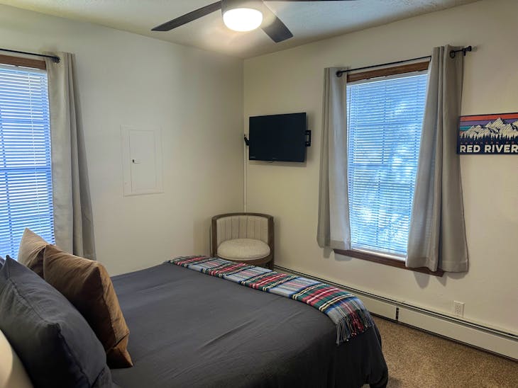 Riverbend Townhouse #1 “Hummerhaven” is a four-bedroom unit located on the river that can sleep up to 10. This combines both the #1A and #1E units which can be rented separately. The front door of the “A” unit opens to a stairway leading up to the 2nd floor where there are two bedrooms. The 1st bedroom has a queen bed and the 2nd bedroom has a queen bed. There is a full bath (tub/shower) in the hallway. The main living area and full-sized kitchen are located on the 3rd level where you can warm up to the wood burning fireplace. There is a flat-screen smart Tv for your entertainment. By the dining area, a patio door opens to a private balcony with beautiful views of the mountains! On this level, there is a bathroom with a shower, as well. From here the stairs lead up to a loft that overlooks the living area below. In the loft, there are two queen beds. Part of this rental includes the “E” (efficiency) unit on the ground floor. This unit has its own kitchen, full bath (tub/shower), and king size bed. The “E” unit also has a private entrance. The Riverbends are 5-6 blocks from the main ski area and are also on the route of the Red River Miner trolley. This property does have high speed wifi. No washer/dryer. All reservations are subject to our rental terms and conditions and cancellation/refund policy. In the event of a cancellation, merchant service charges are non-refundable. If you have any questions, please reach out prior to your stay. **Please note that during the fall of 2024 and spring/summer of 2025 the town of Red River will be replacing waterlines. Their normal working hours are from 7am-5pm Monday-Friday; however, there might be times that they have to conduct work during the weekends. You can expect traffic distributions and temporary water outages while they are working. Please note that on-street residential parking might not be available during construction. During these times, access to Red River and Pioneer Creek recreational area might be reduced or diverted. Please be aware that any construction or town activity is not in our control. If you have any questions, please let us know.