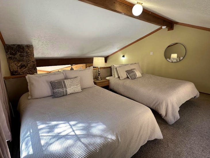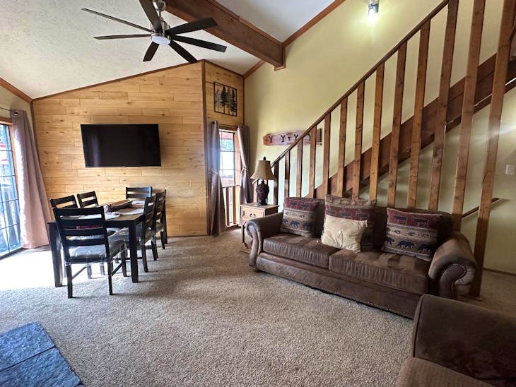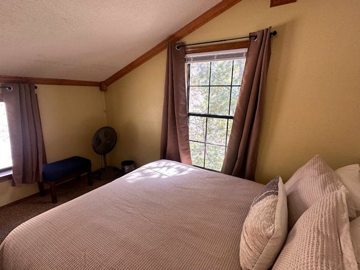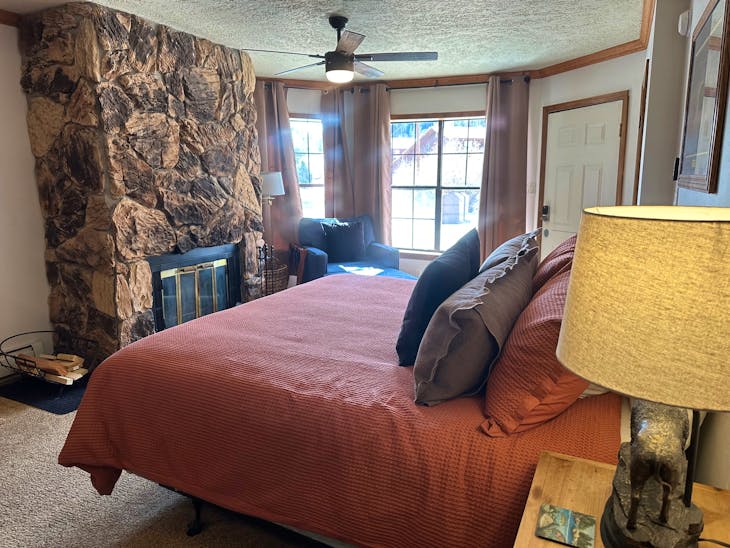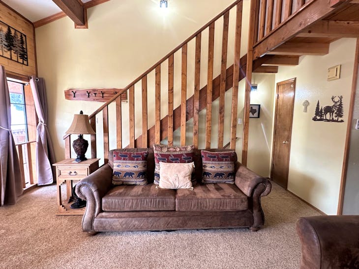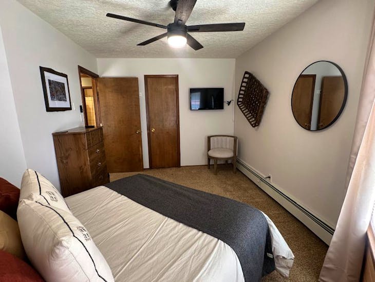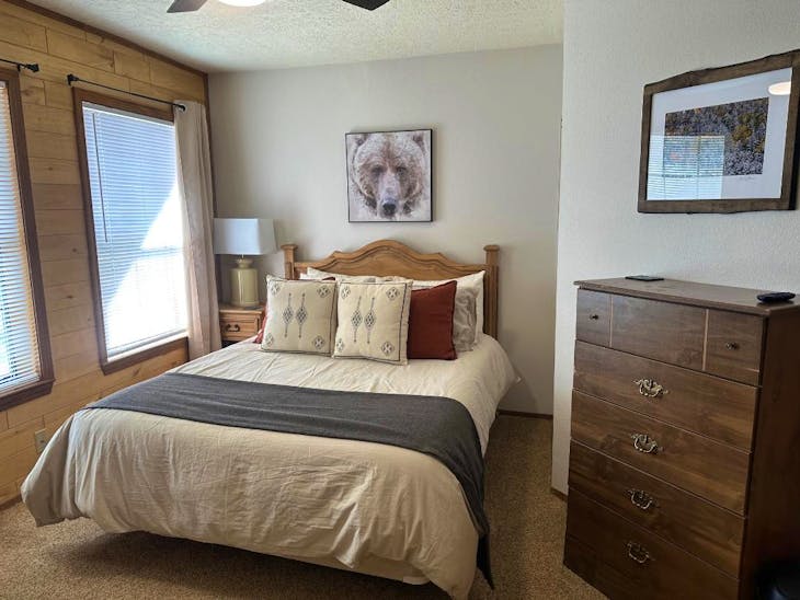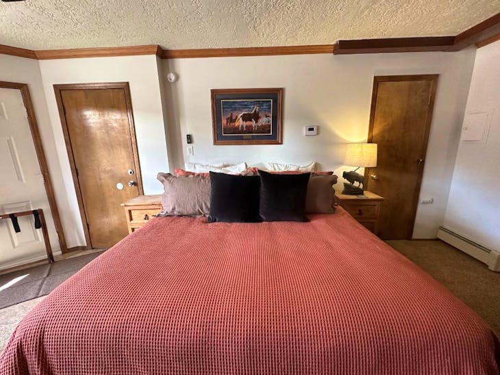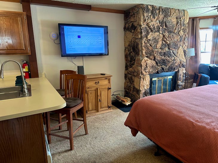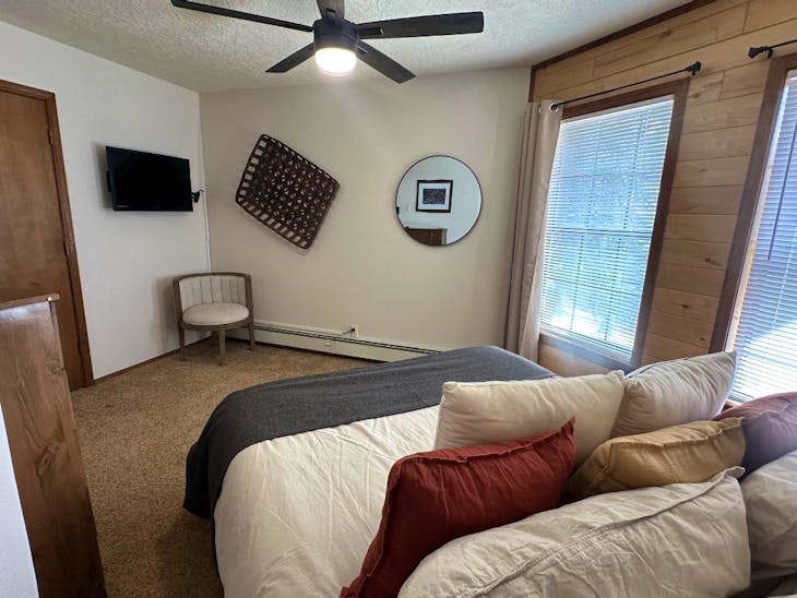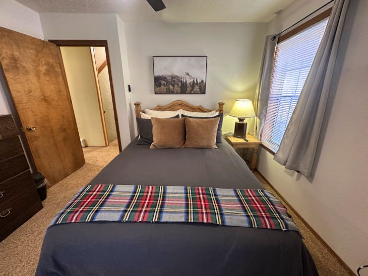 Riverbend Townhouse #1 “Hummerhaven” is a four-bedroom unit located on the river that can sleep up to 10. This combines both the #1A and #1E units which can be rented separately. The front door of the “A” unit opens to a stairway leading up to the 2nd floor where there are two bedrooms. The 1st bedroom has a queen bed and the 2nd bedroom has a queen bed. There is a full bath (tub/shower) in the hallway. The main living area and full-sized kitchen are located on the 3rd level where you can warm up to the wood burning fireplace. There is a flat-screen smart Tv for your entertainment. By the dining area, a patio door opens to a private balcony with beautiful views of the mountains! On this level, there is a bathroom with a shower, as well. From here the stairs lead up to a loft that overlooks the living area below. In the loft, there are two queen beds. Part of this rental includes the “E” (efficiency) unit on the ground floor. This unit has its own kitchen, full bath (tub/shower), and king size bed. The “E” unit also has a private entrance. The Riverbends are 5-6 blocks from the main ski area and are also on the route of the Red River Miner trolley. This property does have high speed wifi. No washer/dryer. All reservations are subject to our rental terms and conditions and cancellation/refund policy. In the event of a cancellation, merchant service charges are non-refundable. If you have any questions, please reach out prior to your stay. **Please note that during the fall of 2024 and spring/summer of 2025 the town of Red River will be replacing waterlines. Their normal working hours are from 7am-5pm Monday-Friday; however, there might be times that they have to conduct work during the weekends. You can expect traffic distributions and temporary water outages while they are working. Please note that on-street residential parking might not be available during construction. During these times, access to Red River and Pioneer Creek recreational area might be reduced or diverted. Please be aware that any construction or town activity is not in our control. If you have any questions, please let us know.