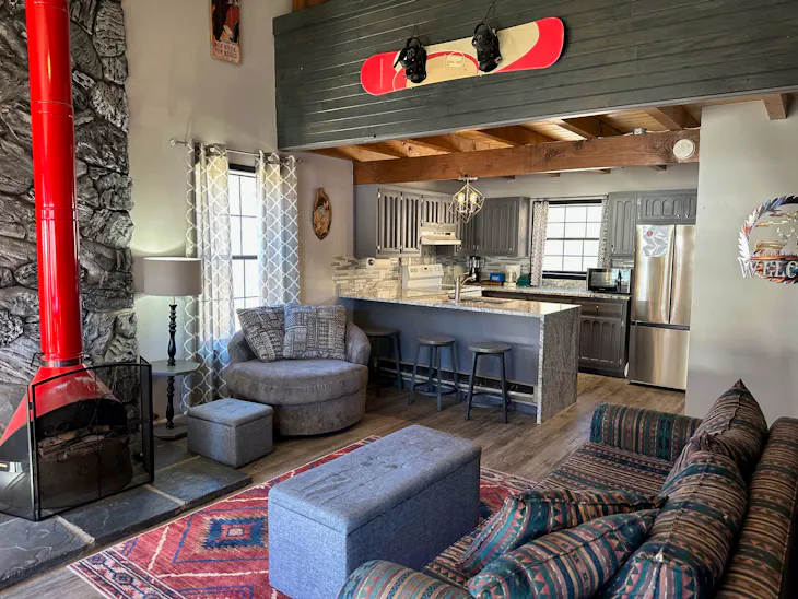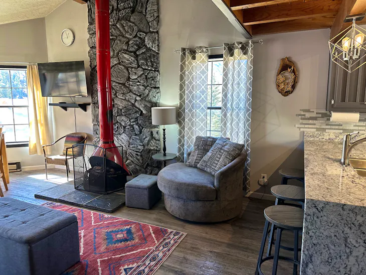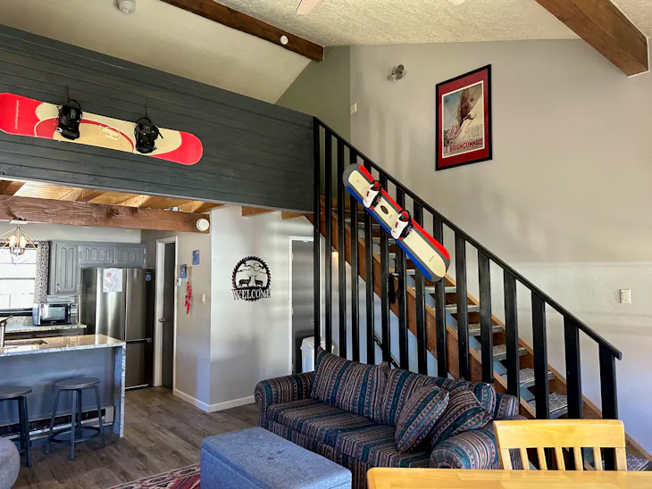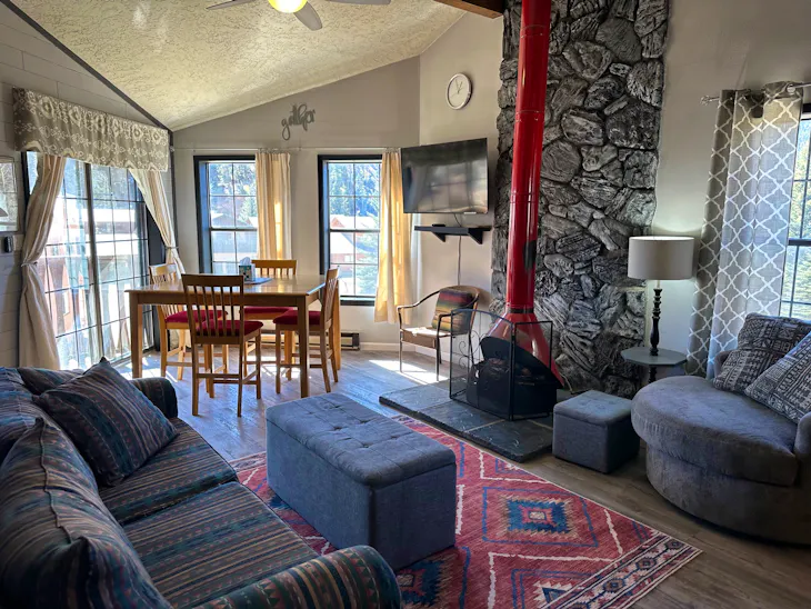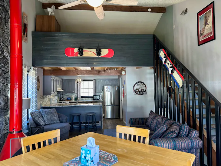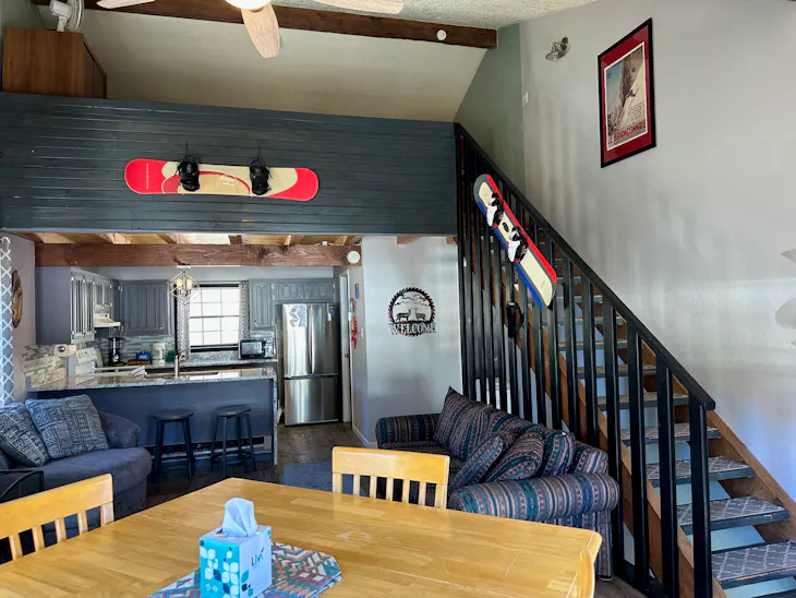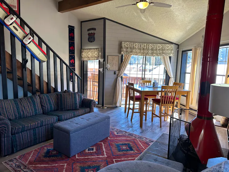 Riverbend Townhouse #8A is a 3 bedroom on the River which can sleep up to 9. The front door of the “A” unit opens to a stairway leading up to the 2nd floor where there are two bedrooms. The 1st bedroom has a queen-size bed and the 2nd bedroom has a king-size bed. There is a full bath (tub/shower) in the hallway. The main living area and full-sized kitchen are located on the 3rd level where you can warm up to the gas fireplace. There is a flat-screen satellite Tv for your entertainment. By the dining area, a patio door opens to a private balcony with beautiful views of the mountains! On this level, there is a bathroom with a shower as well. From here the stairs lead up to a loft that overlooks the living area below. In the loft, there are two full beds and one twin bed. The Riverbend's are 5-6 blocks from the main ski area and are also on the route of the Red River Miner trolley. There are two car parking spots reserved for this unit or 1 car and a trailer. This property does have high speed wifi. No washer/dryer. Trailer parking for a small trailer only. The property offers a hot tub that is shared with guests that are staying at Riverbend 8E. (deposit required) All reservations are subject to our rental terms and conditions and cancellation/refund policy. In the event of a cancelation, merchant service charges are non-refundable. If you have any questions, please reach out prior to your stay. Riverbend 8 is a pet-friendly property with only 1 dog under 100 lbs (with a non-refundable pet fee, due at check in). For larger groups, please consider adding Riverbend 8E and/or Riverbend 7A & 7E. **Please note that during the fall of 2024 and spring/summer of 2025 the town of Red River will be replacing waterlines. Their normal working hours are from 7am-5pm Monday-Friday; however, there might be times that they have to conduct work during the weekends. You can expect traffic distributions and temporary water outrages while they are working. Please note that on-street residential parking might not be available during construction. During these times, access to Red River and Pioneer Creek recreational area might be reduced or diverted. Please be aware that any construction or town activity is not in our control. If you have any questions, please let us know.