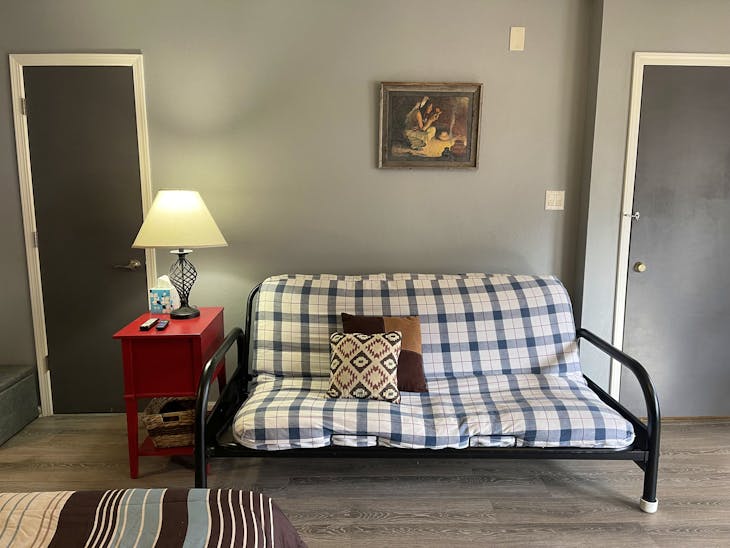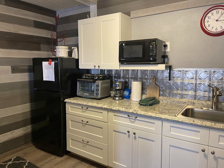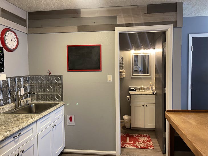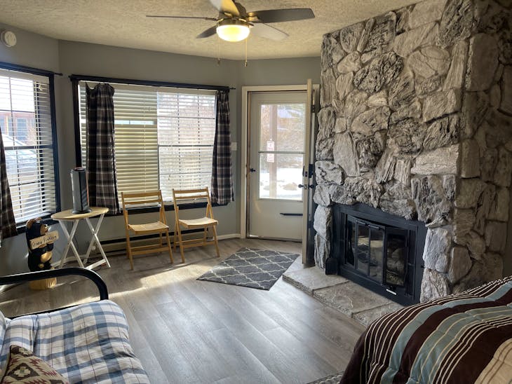 Riverbend 8E is a recently updated corner studio unit on the river with easy parking right at your door. This unit is ideal for two adults with a queen size bed but can sleep up to four with a full size sofa sleeper as well. Your kitchenette is equipped with a microwave oven, convection oven, hot plate, coffee pot and toaster, along with a complete set of dishes and silverware for four. Warm up by the gas burning fireplace year round and the satellite Tv with DvD player. This property does have a hot tub (deposit required), and Wifi. The hot tub is shared with guests at Riverbend 8A. All towels and linens are provided and towels can be exchanged every other day at our office for fresh ones. This unit has a walk in shower in the bathroom. No washer/dryer. Other items we provide include paper towels, dish and bath soap, shampoo and conditioner, make-up removal supplies, and coffee. The property is located on the western side of town and is just 5-6 blocks from the Ski area. This property will accept one dog under 100 lbs with a $125 non-refundable pet fee. Pet Fee: If pet fee isn't charged at time of booking it may be charged at time of check in. The Red River Miner’s Transit provides free year-round service to any individual needing transportation. All reservations are subject to our rental terms and conditions and cancellation/refund policy. In the event of a cancelation, merchant service charges are non-refundable. If you have any questions, please reach out prior to your stay. **Please note that during the fall of 2024 and spring/summer of 2025 the town of Red River will be replacing waterlines. Their normal working hours are from 7am-5pm Monday-Friday; however, there might be times that they have to conduct work during the weekends. You can expect traffic distributions and temporary water outrages while they are working. Please note that on-street residential parking might not be available during construction. During these times, access to Red River and Pioneer Creek recreational area might be reduced or diverted. Please be aware that any construction or town activity is not in our control. If you have any questions, please let us know.