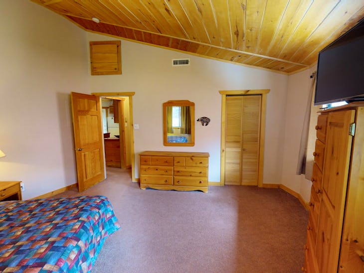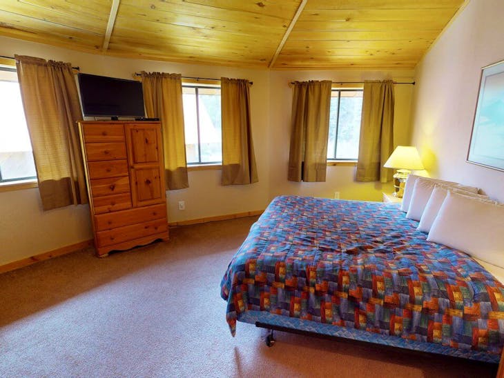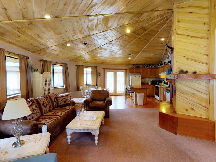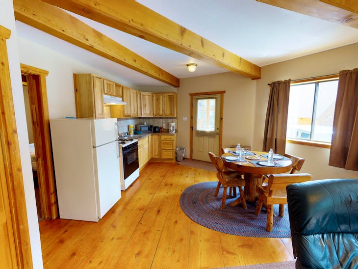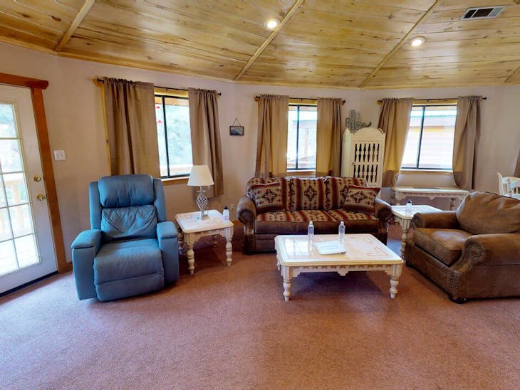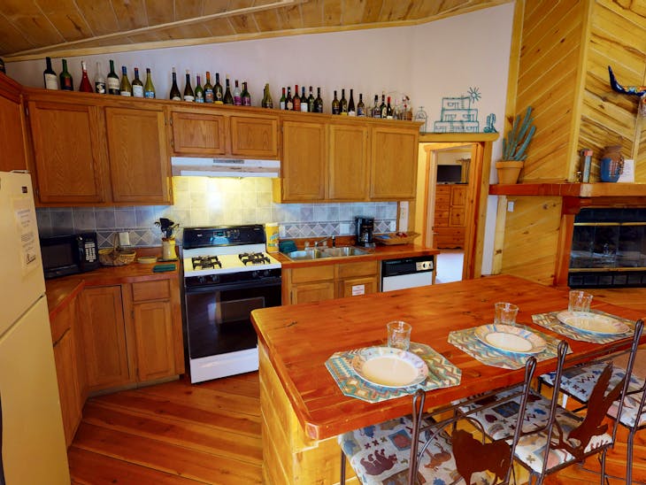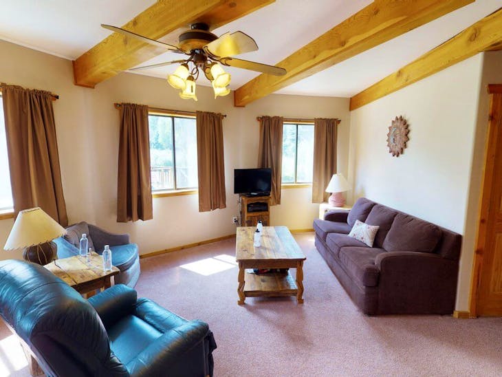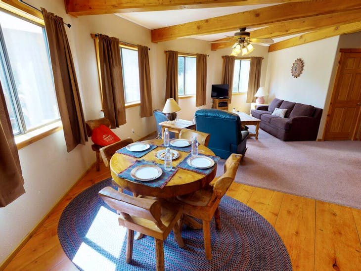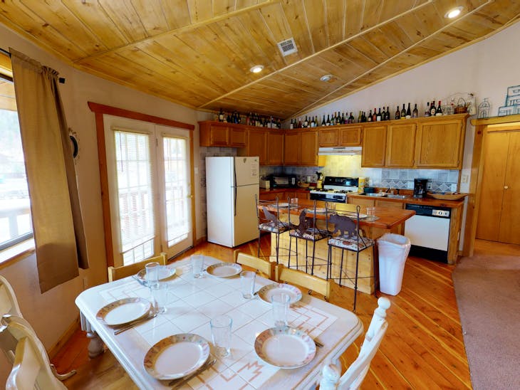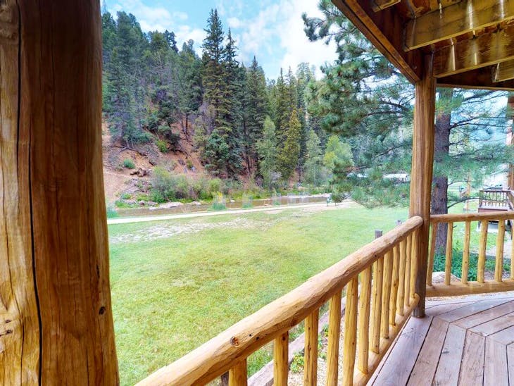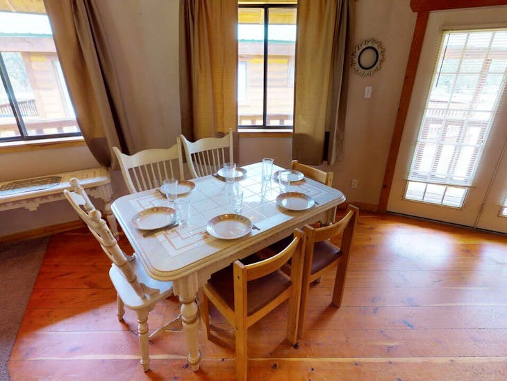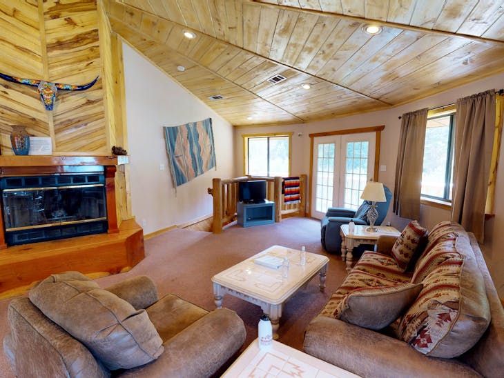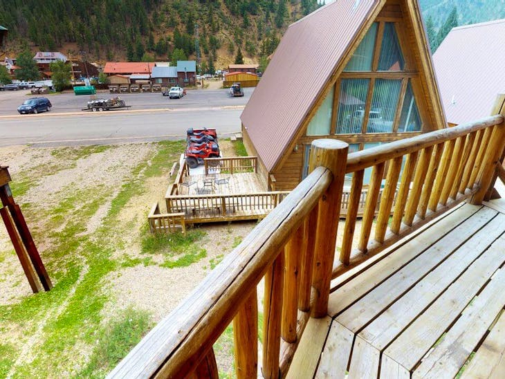 Looking for a rental that’s just as unique as your Red River vacation? Then Round Eagle is right up your alley! The Round Eagle is a three bedroom deluxe home that sleeps up to 10 and is right on the River in the center of town. This two story home has a fully equipped kitchen, living room, and dining area on each floor. Step out onto the porch and soak in the 180 degrees of serene mountain skyline. The first floor has two bedrooms and a full bath (tub/shower) in between. Bedroom #1 has a king bed and bedroom #2 has a full size bed. There is also a flat screen Tv in the downstairs living area as well as a queen sleeper sofa. The upper floor has one bedroom with a king bed and a flat screen Tv. There is also one full bath (tub/shower) with Washer/Dryer combo. In the center of the living area is a gas log fireplace along with a flat screen Tv for your entertainment and a queen sleeper sofa. This property has a total of 2034 square feet and the property does have satellite wifi All reservations are subject to our rental terms and conditions and cancellation/refund policy. In the event of a cancelation, merchant service charges are non-refundable. If you have any questions, please reach out prior to your stay. This property is one block from the Copper Chair Lift. No trailer parking available. The municipal parking lot is nearby.